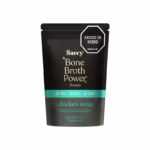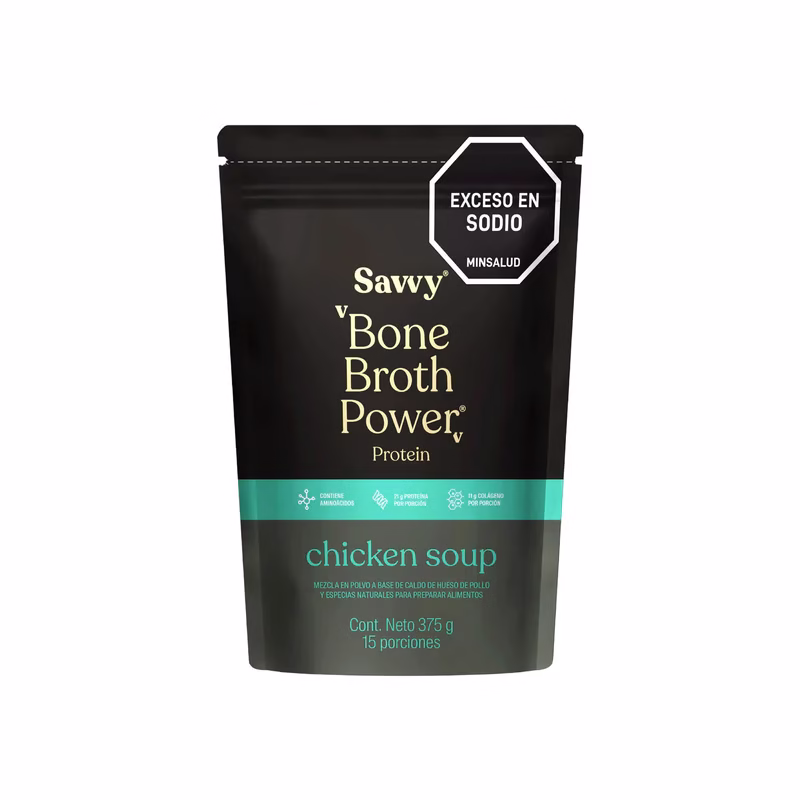 Composición: Caldo de hueso de pollo en polvo (caldo de huesos y grasa de pollo (0.6 g*)), Colágeno hidrolizado, acentuador del sabor (cloruro de potasio), aceite de coco en polvo, vinagre de manzana, sal, estabilizador (goma de acacia) y papaína. * Proporción de producto (25 g).
